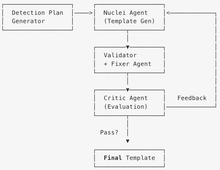 Rather than accepting the first AI-generated template, the pipeline passes each template through a validation-feedback cycle. A Critic Agent evaluates the output and provides specific feedback to the Nuclei Agent for regeneration. This iterative refinement, borrowed from reinforcement learning, typically requires 2-3 iterations before a template reaches production quality — catching syntax errors, schema violations, and false positive risks that single-shot generation would miss.