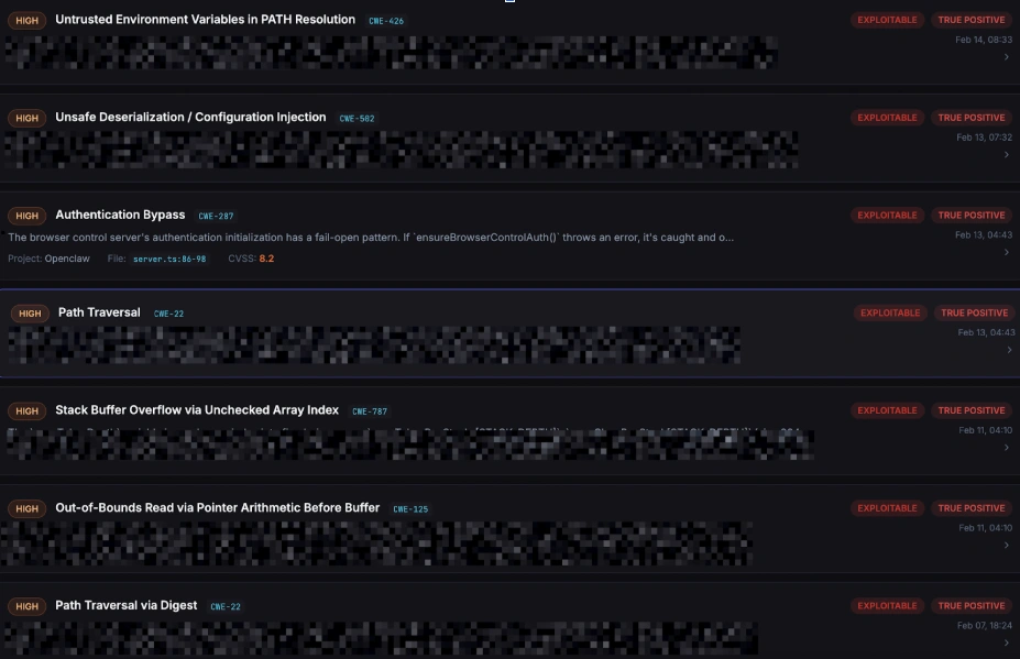 As part of our continuous monitoring of the open-source ecosystem, we analyzed OpenClaw, an increasingly popular AI agent framework. Our platform identified several high-severity issues: