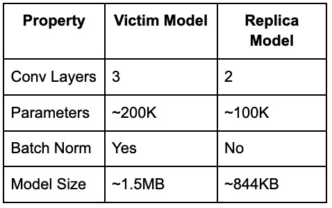 Our replica model uses a deliberately different, simpler architecture to demonstrate that model extraction works even when the attacker doesn’t know the victim’s architecture. The stolen model learns to mimic behavior, not replicate structure. The following table compares the architecture of the victim model and the replica model.
