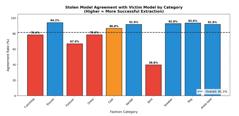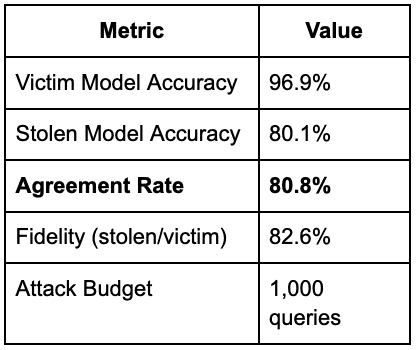 The agreement rate is how often the stolen model’s prediction matches the victim’s, the key metric. At 80.8%, the stolen model reproduces the victim’s behavior on 4 out of 5 inputs.