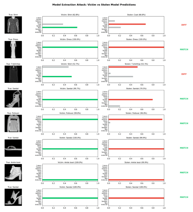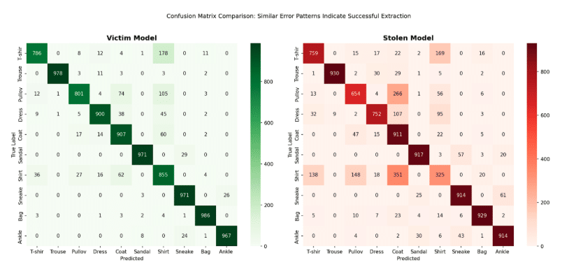 Notice how even when both models are wrong, they’re often wrong in the same way. The stolen model has learned the victim’s decision boundaries, including its failure modes.